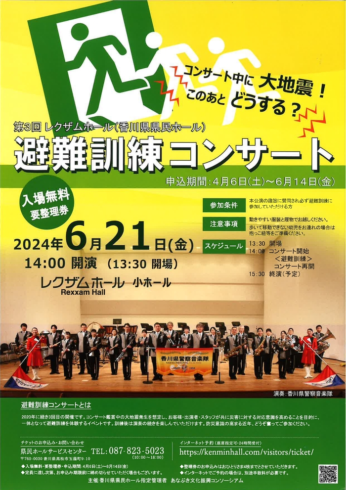 今回は、〈香川県警察音楽隊〉によるコンサート中に大地震が発生したことを想定し、スタッフ、お客様、出演者がそれぞれの立場で避難・誘導を実際に体験することを目的としています。