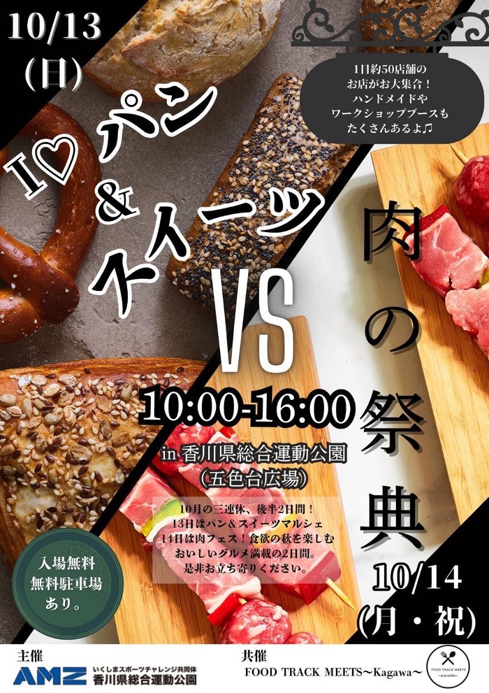 香川県総合運動公園(香川県高松市生島町、所長:橋本 一二)は、様々なパンやスウィーツを楽しめる「I♥パン&スウィーツマルシェ」を2024年10月13日(日)に、初開催の「肉フェス」を10月14日(月祝)に開催いたします。