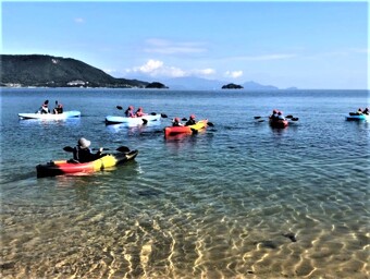 津田の松原は、瀬戸内海国立公園に指定されており、津田の松原海水浴場は「日本渚百選」にも選ばれ、毎年多くの来訪者で賑わい、その美しさが評価されています。この美しい自然や海の観光地としての魅力だけでなく、その裏側にある海ごみの現状や環境問題について座学を通して知識を深め、実際にシーカヤックで海を巡り海中のごみの状況を間近に観察します。各施設から集った従業員が、今回学んだことを自らの業務に紐づけて活動していく事を目的としています。