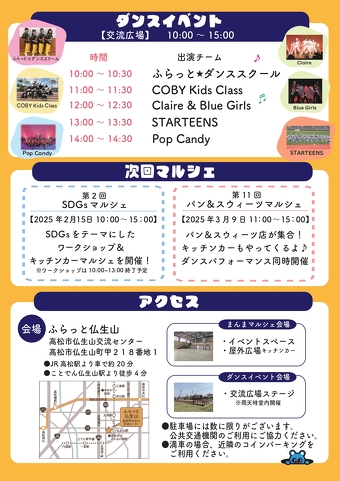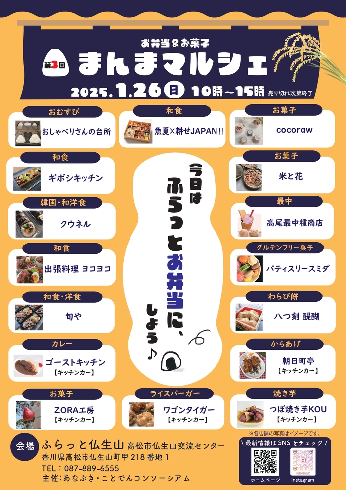 ふらっと仏生山 高松市仏生山交流センター(香川県高松市仏生山町甲218番地1、館長:宮本令子)では、地域の賑わい創りの一環として、素材にこだわったお菓子とお弁当のコラボイベント、まんまマルシェを2025年1月26日(日)10時から開催します。