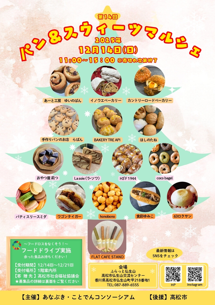 ふらっと仏生山 高松市仏生山交流センター (香川県高松市仏生山町甲218番地1、館長:宮本 令子)で、地域の賑わい創りの一環として、パン&スウィーツマルシェを2025年12月14日(日)11時から開催します。