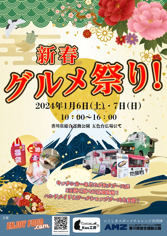香川県総合運動公園(香川県高松市生島町、所長:友国 崇)は、新春の華やかな屋外イベント「新春グルメ祭り」を2024年1月6日(土)7日(日)の2日間 開催します。
