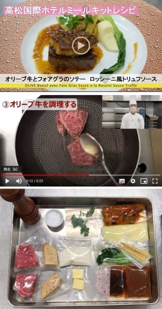 第一弾は、当ホテルのレストランぐりる屋島で提供する、フランス料理の王道「オリーブ牛とフォアグラのソテーロッシーニ風トリュフソース」です。ご家庭の食卓では、なかなか味わうことのできない豪華食材を使いながらも、簡単に作れるレシピを考案いたしました。また香川県認定の「さぬきダイニング認定店」として、県産食材を使用したミールキットレシピを販売し、その魅力を積極的に発信していきます。ご購入されたお客様は、付属のミールキットとレシピ動画を見ながら、料理に挑戦していただきます。外食を自粛される方、大切な方へのおもてなしにご利用いただければと思います。