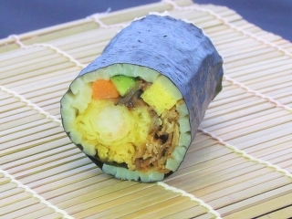 酢飯の代わりに讃岐うどんを海苔の上に一本一本丁寧に敷き詰め、うどんのトッピングでお馴染みのえび天や牛肉などの具を包んだ、うどん愛溢れる恵方巻です。讃岐うどんは、当施設のセルフうどん店「あなぶき家」のうどんを使用しています。