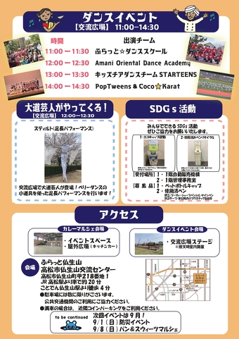 また交流広場では大道芸人のパフォーマンスやキッズダンスイベントも同時開催いたします。