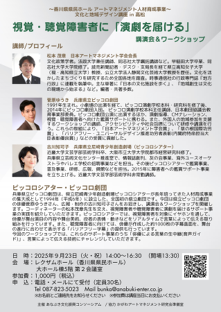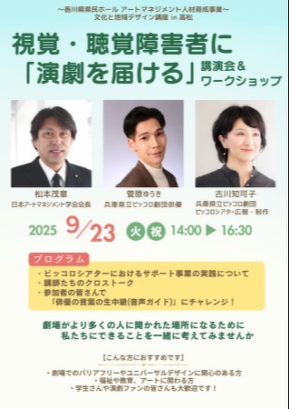 レクザムホール(香川県県民ホール 館長:谷 明子 以下当館)では2025年9月23日(火・祝)に、「視覚・聴覚障害者に「演劇を届ける」講演&ワークショップ」を開催します。