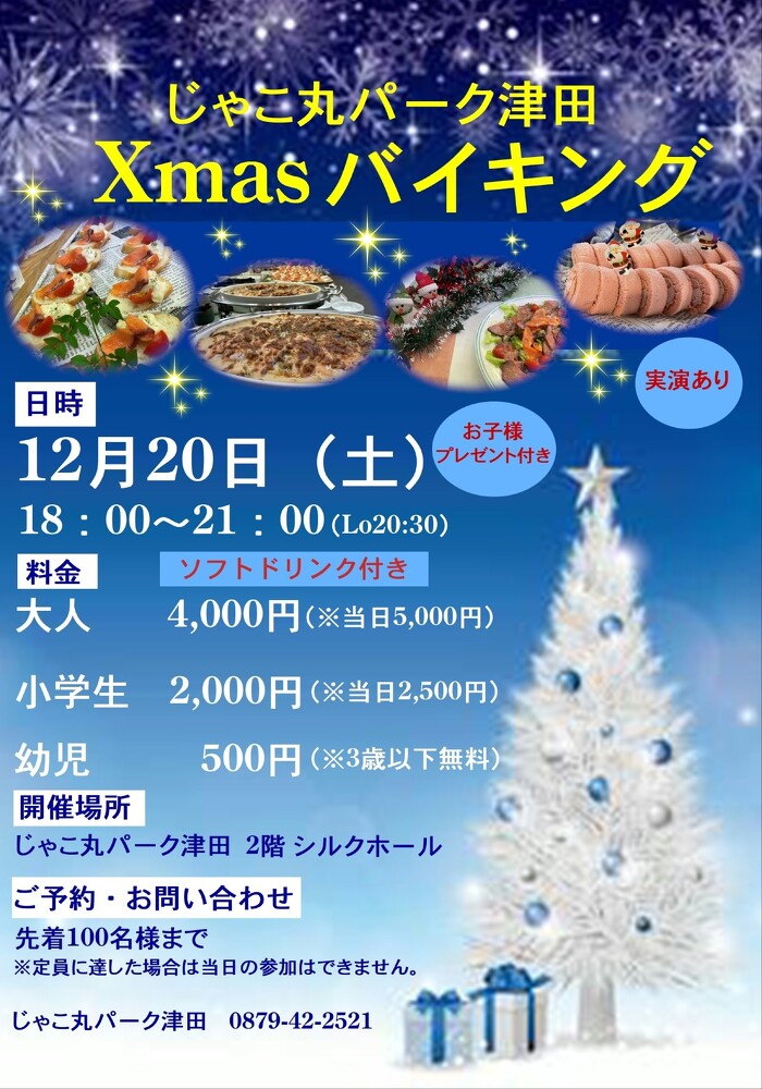 穴吹エンタープライズ株式会社(本社:香川県高松市、代表取締役社長:三村和馬、以下、当社)が運営する国民宿舎松琴閣「じゃこ丸パーク津田」(香川県さぬき市津田町、総支配人:中村芳孝)で12月20日聖夜を彩る特別イベント「Xmasバイキング」を開催いたします。