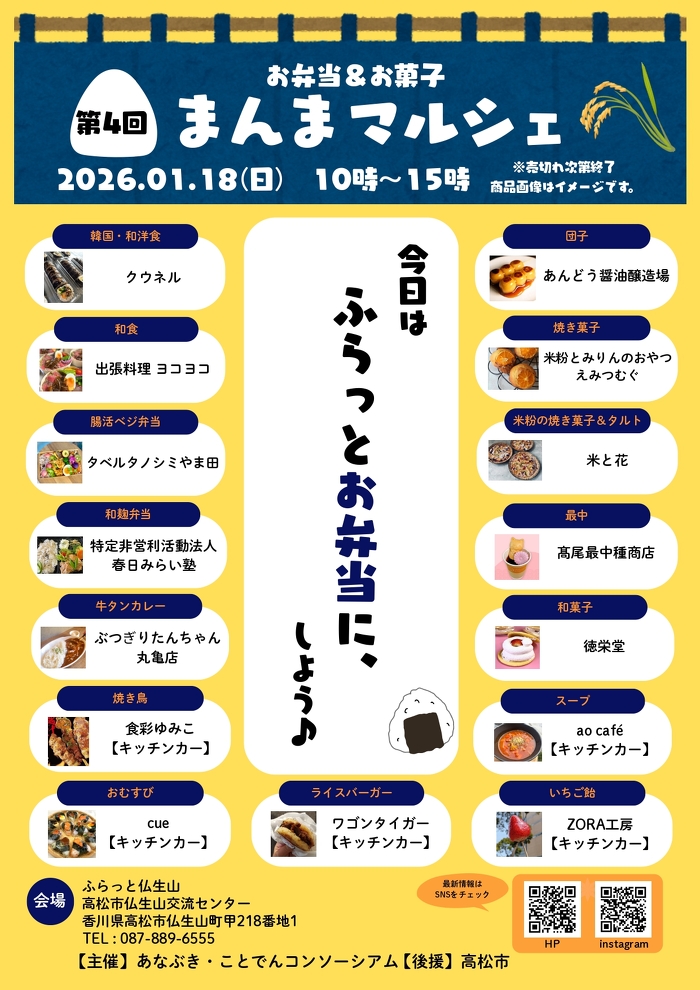 ふらっと仏生山 高松市仏生山交流センター(香川県高松市仏生山町甲218番地1、館長:宮本令子)では、地域の賑わい創りの一環として、素材にこだわったお弁当とお菓子のコラボイベント、まんまマルシェを2026年1月18日(日)10時から開催します。