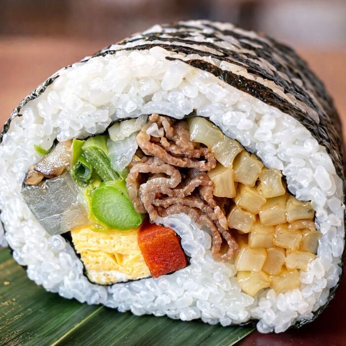 うどんの原料は「さぬきの夢」。お米は「おいでまい」。 具材には、香川県産のアスパラガス、しいたけ、大根、金時人参、玉子、太ネギ、そして甘辛く煮込んだオリーブ牛の7種を使用。そして中央に巻き込んださぬきうどん。出汁の旨みが広がる味わいは、うどんすきを思わせながらも、酢飯とともに楽しめることで、うどんとごはんの“二層のおいしさ”を一度に味わえる贅沢な恵方巻です。