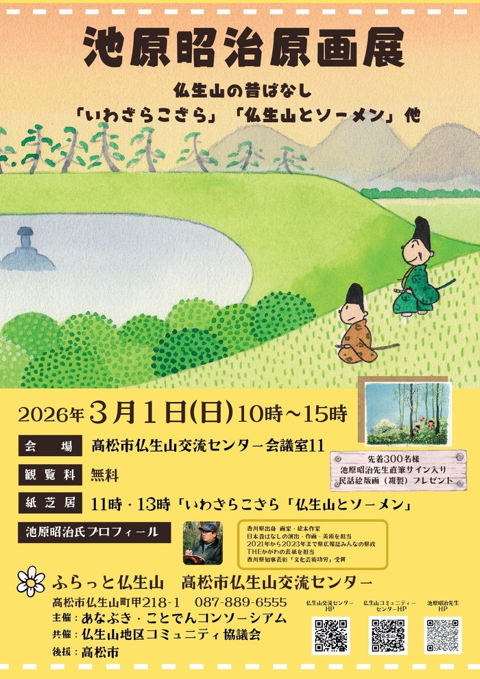 ふらっと仏生山 高松市仏生山交流センター(香川県高松市仏生山町甲218番地1、館長:宮本令子)では、地域の賑わい創りの一環として、「池原昭治原画展」を2026年3月1日(日)10時から開催します。「カラダとココロのすこやか交流」をコンセプトとし、これまでも食のイベントなどを開催してまいりましたが、この度、地域課題解決につながる活動として、「池原昭治原画展」を開催いたします。