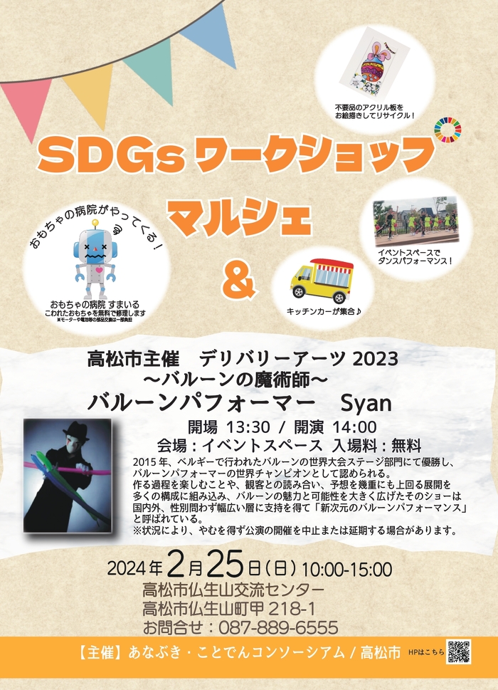 14時からは高松市主催デリバリアーツ2023バルーンパフォーマーSyan」のステージイベント(13時30分開場 14時開演 入場無料)において、新次元のバルーンパフォーマンスをお楽しみいただきます。